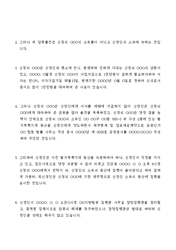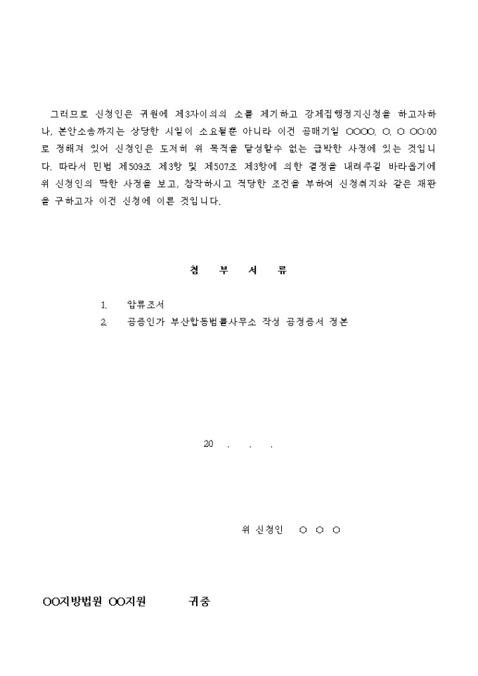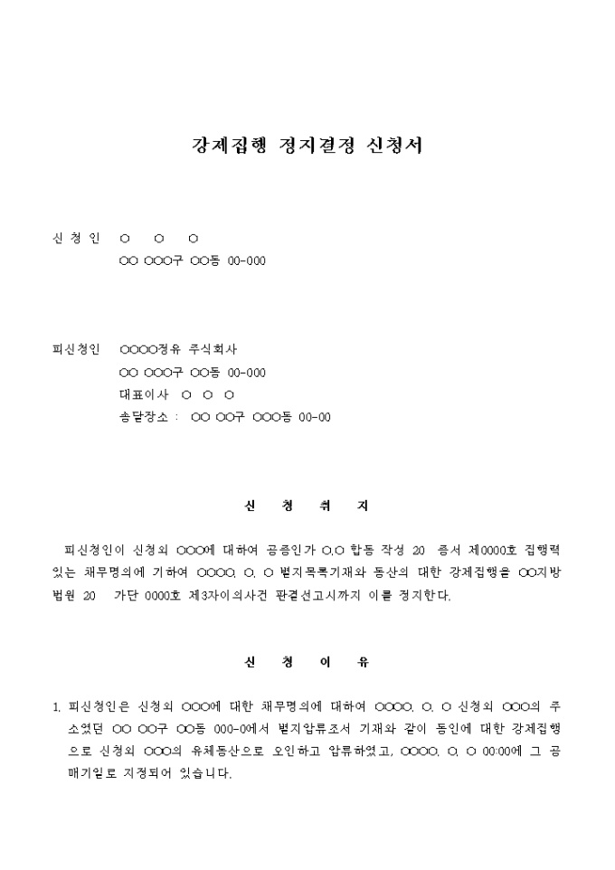 소유자를 잘못알고 오인압류한 것을 이유로 하는 강제집행 정지결정 신청서입니다.