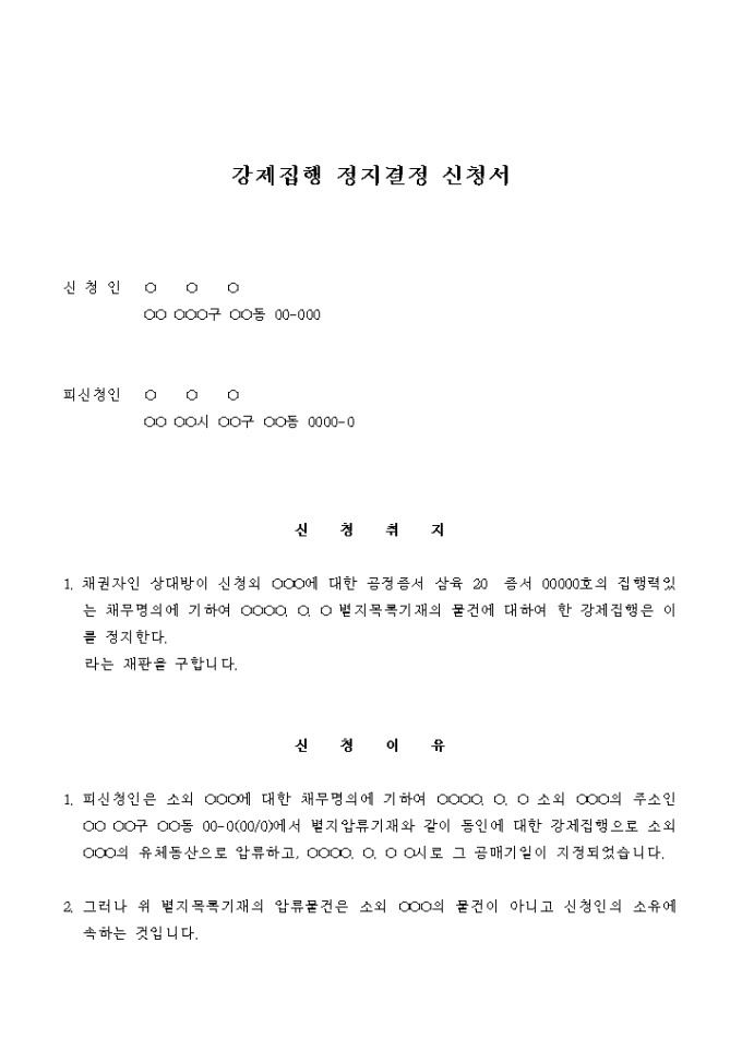 집행물의 소유가 채무자의 것이 아님을 이유로하는 강제집행 정지결정 신청서입니다.