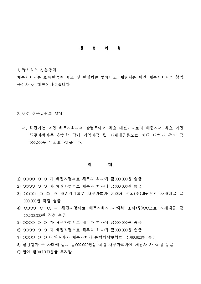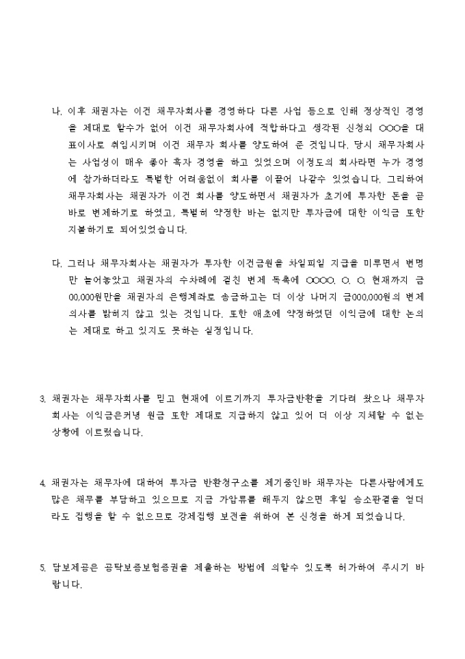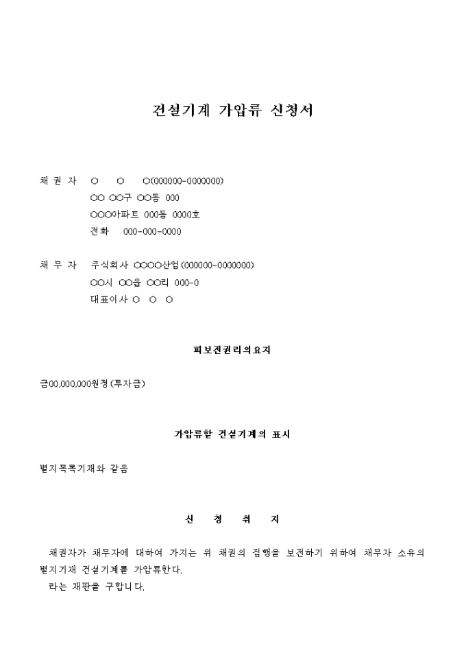 9,000원/월투자금의 반환청구 채권을 보전하기 위한 건설기계 가압류 신청서입니다.