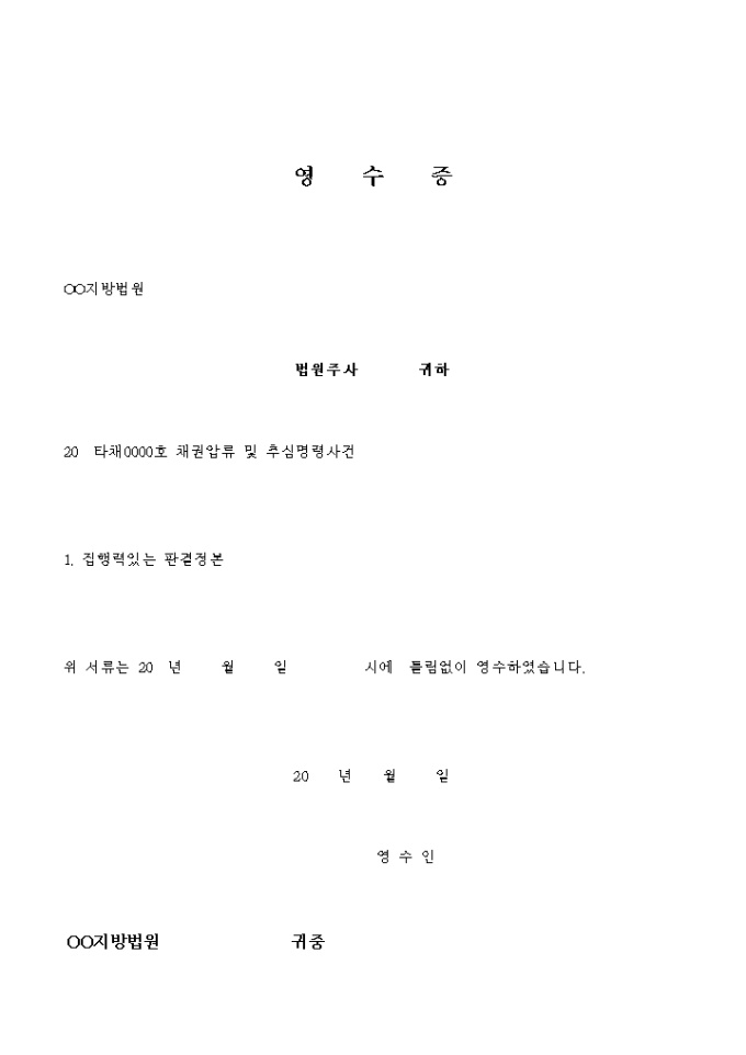 9,000원/월채권압류 및 추심명령사건을 위해 집행력있는 판결정본을 수령하였음을 증명하는 영수증입니다.