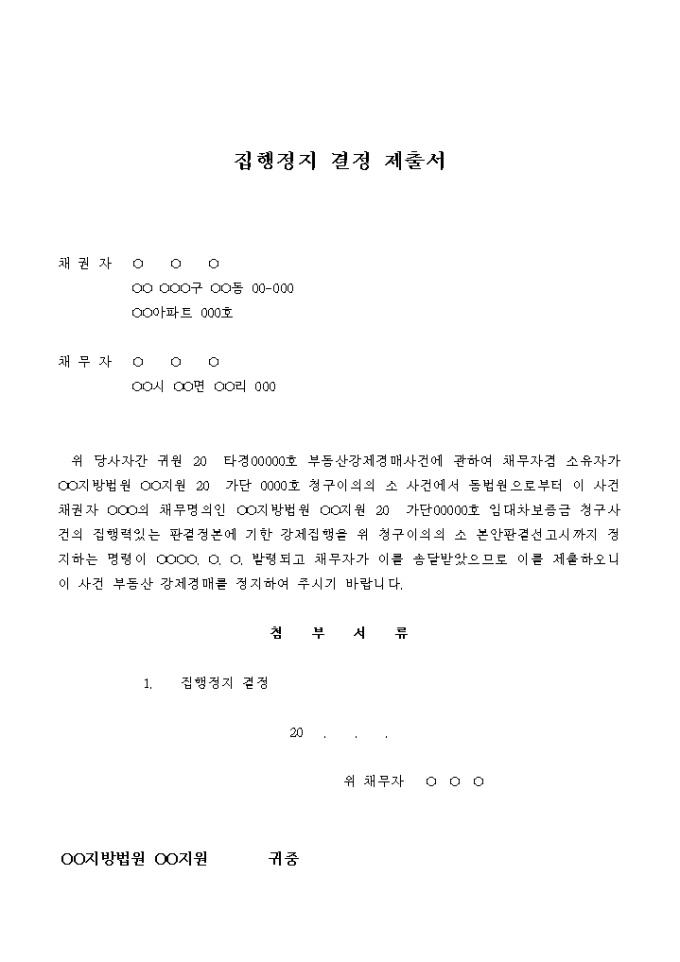 9,000원/월청구이의의 소 본안판결선고시까지 정지하는 명령이 발령되었음을 이유로 제출하는 집행정지 결정 제출서입니다.