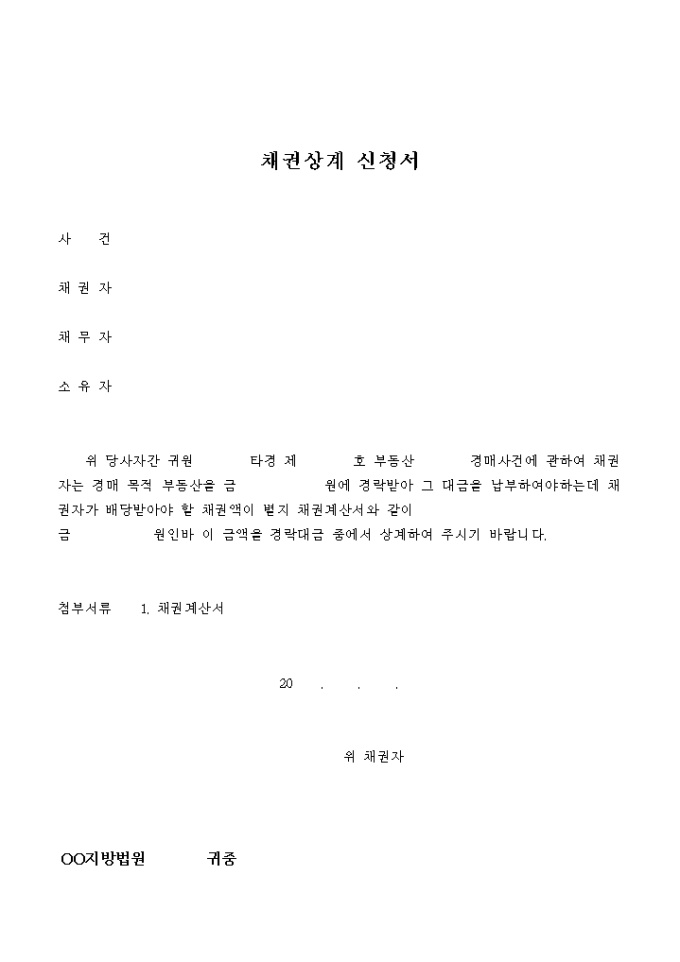 9,000원/월채권상계 신청서의 견본입니다.