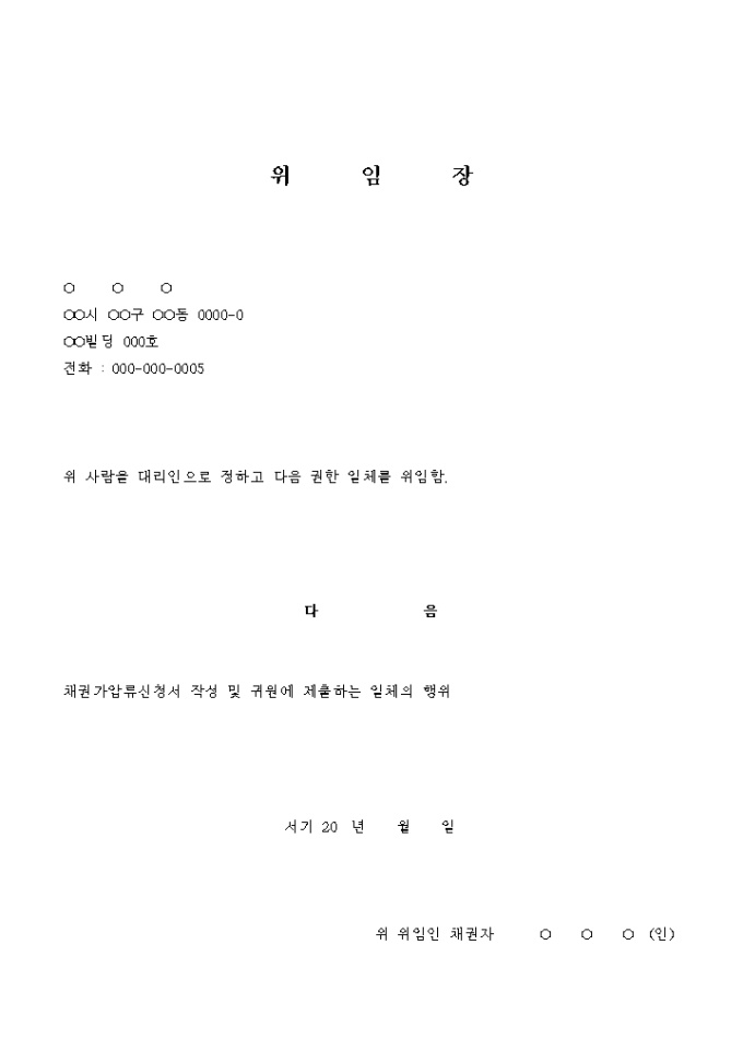 9,000원/월채권가압류 신청을 하는 일체의 권한을 위임하는 위임장입니다.