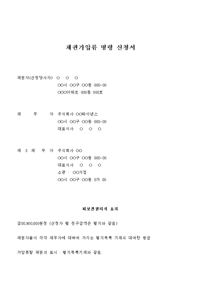 9,000원/월다수의 채권자들이 각각 채무자에 대하여 가지는 별지목록 기재의 대여한 원금 채권을 보전하기 위해 신청하는 채권가압류 명령 신청서입니다.