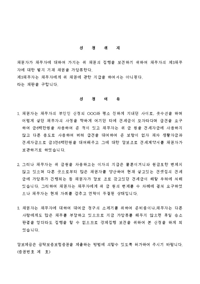 9,000원/월대여금 채권을 보전하기위해 임차료 반환채권에 대하여 채권가압류 명령을 신청하는 서식입니다.