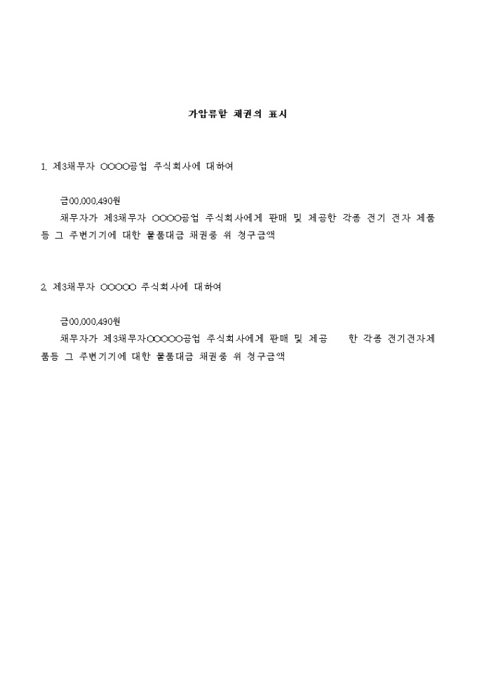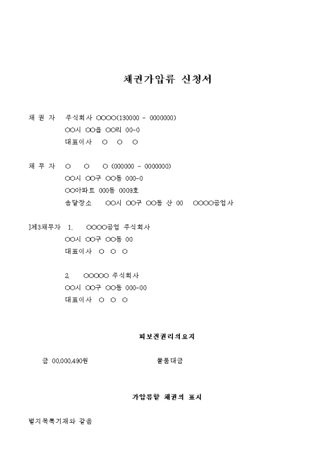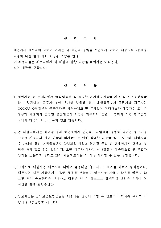 9,000원/월물품대금 채권을 보전하기 위해 다른 물품대금에 대해 채권가압류를 신청하는 신청서입니다.