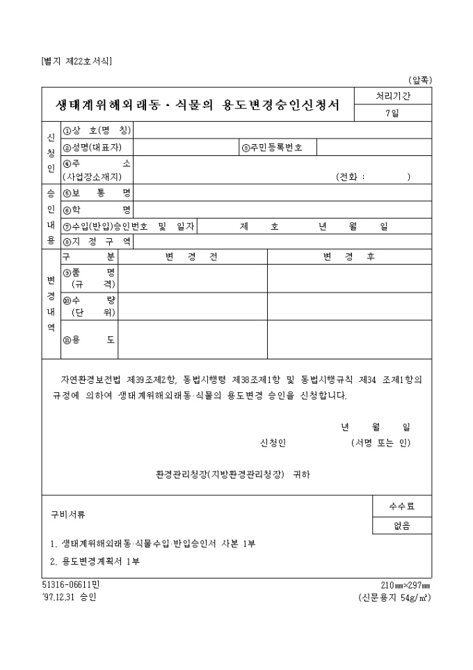 자연환경보전법 제39조제2항, 동법시행령 제38조제1항 및 동법시행규칙 제34 조제1항의 규정에 의하여 생태계위해외래동·식물의 용도변경 승인을 신청할 때 사용하는 "생태계 위해 외래동,식물의 용도 변경 승인신청서" 양식입니다.