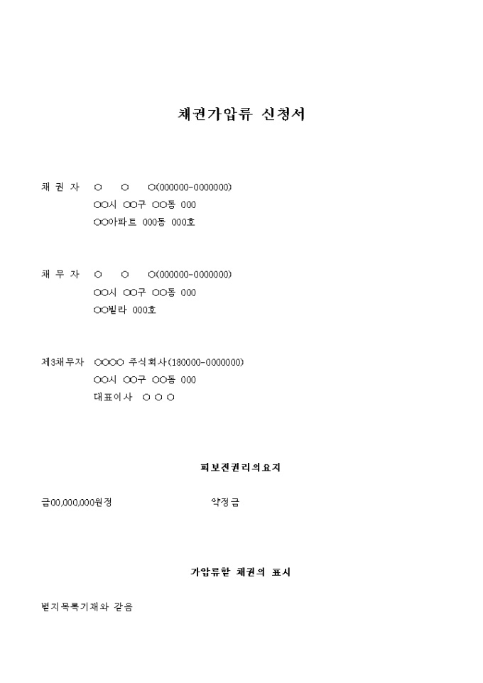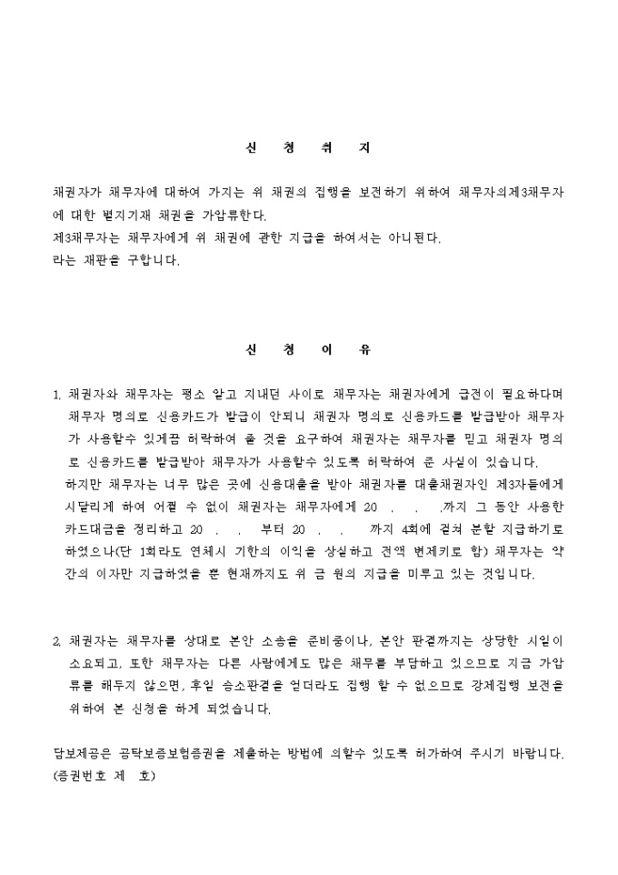 약정금 반환채권의 보전을 위한 채권가압류 신청서입니다.