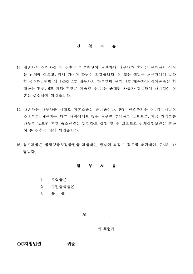 재산분할 청구금 채권을 보전하기 위해 신청하는 채권가압류 신청서입니다.