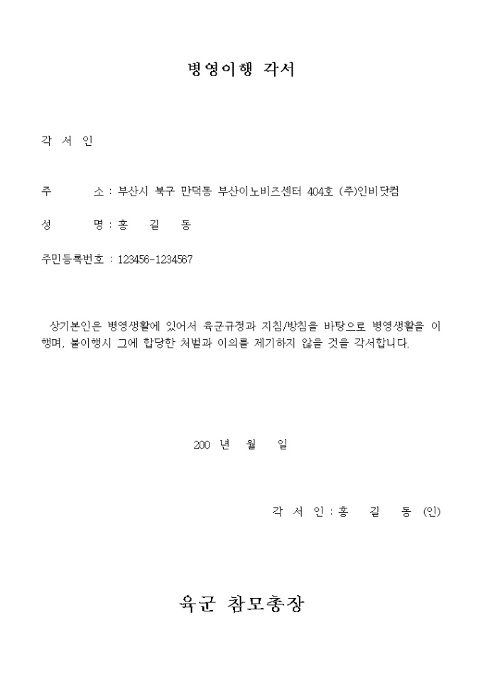 상기본인은 병영생활에 있어서 육군규정과 지침/방침을 바탕으로 병영생활을 이행며, 불이행시 그에 합당한 처벌과 이의를 제기하지 않을 것을 각서하는 양식입니다.