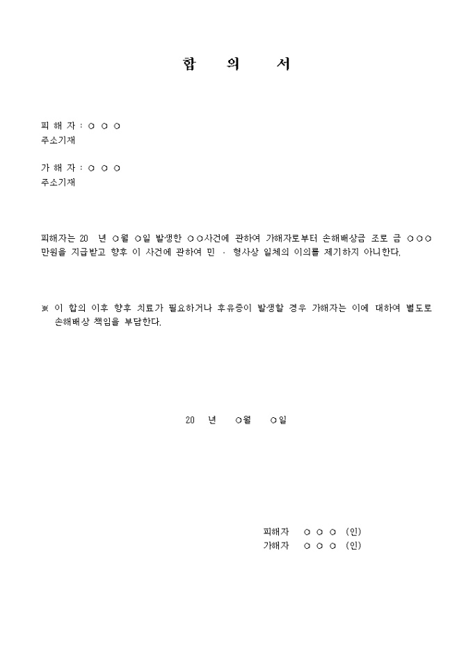 9,000원/월발생한 성희롱(폭력)사건에 대해 가해자로부터 손해배상금을 받고 향후 이건에 대해 민,형사상 제기를 하지 않겠다는 합의서입니다