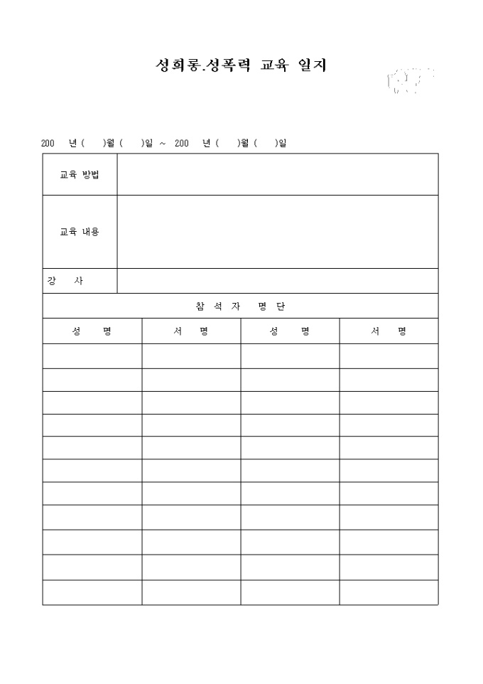교육일자,교육내용,교육방법,참석자 명단을 기록하는 성희롱.성폭력 교육 일지입니다.