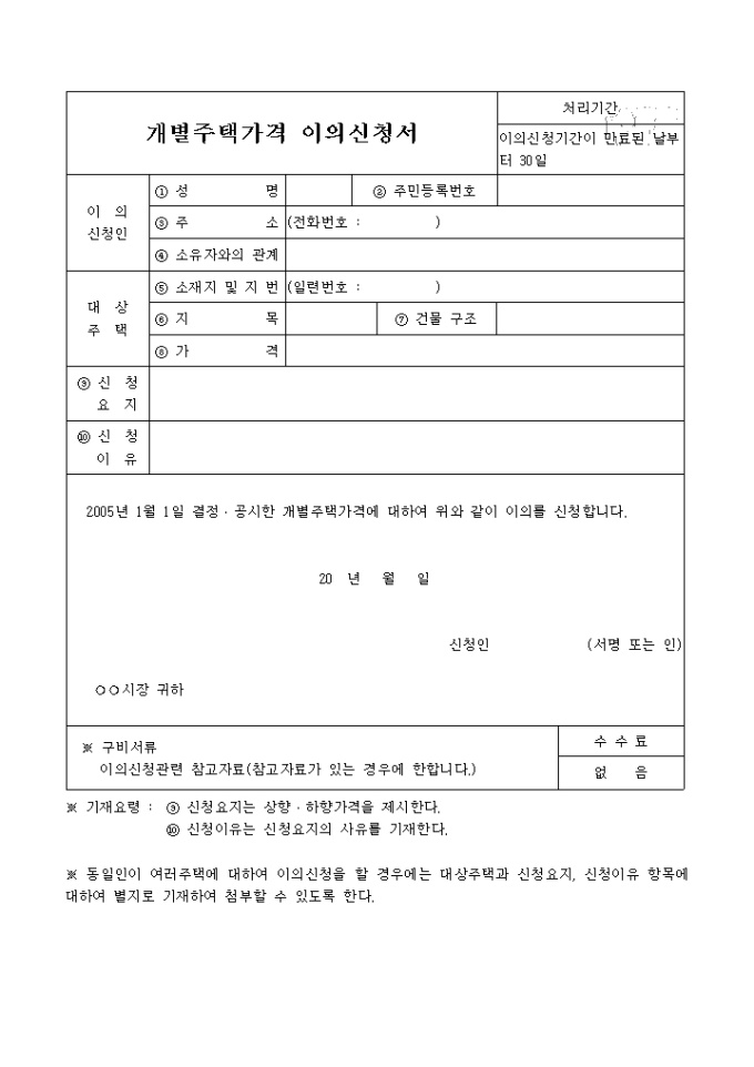 9,000원/월2005년 1월 1일 결정•공시한 개별주택가격에 대하여 이의 신청을 할때 사용하는 양식입니다.