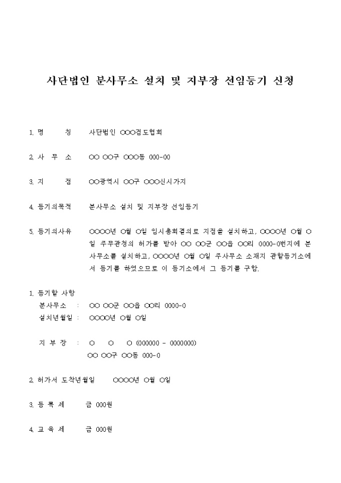 9,000원/월사단법인 분사무소 설치 및 지부장 선임등기 신청서입니다.