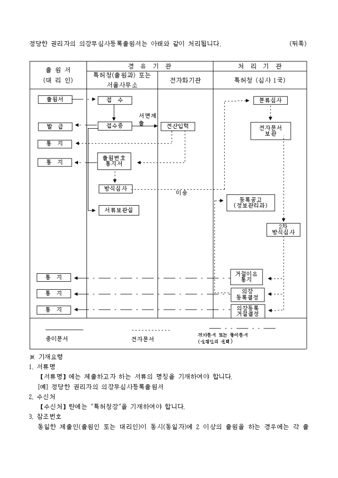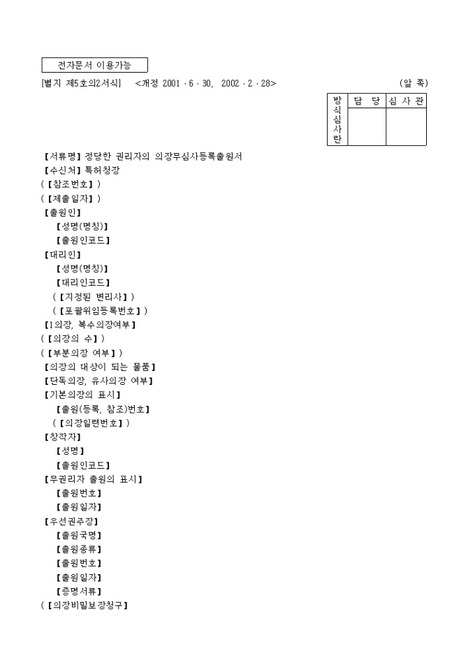 9,000원/월이 서식은 [별지 제5호의2서식]정당한 권리자의 의장무심사등록출원서로서 도면(사진․견본) 1통 (복수의장등록출원인 경우에는 각 의장마다 1통), 정당한 권리자임을 증명하는 서류 1통