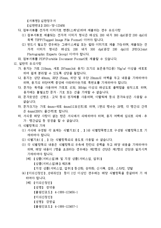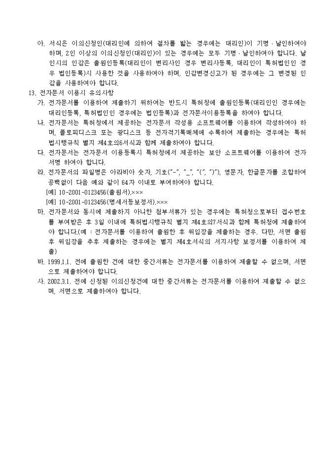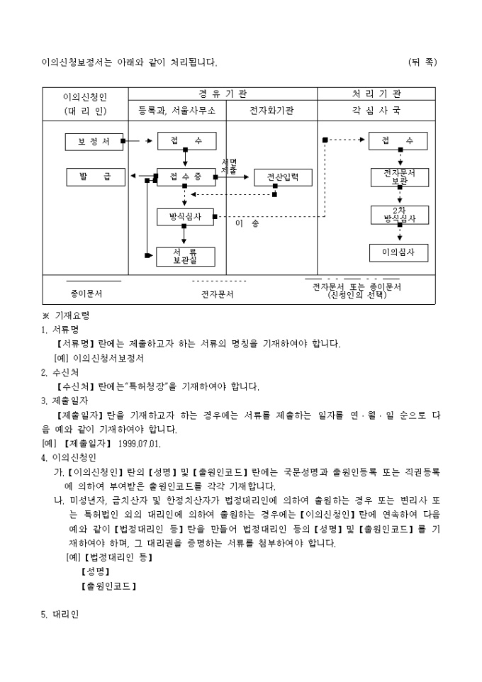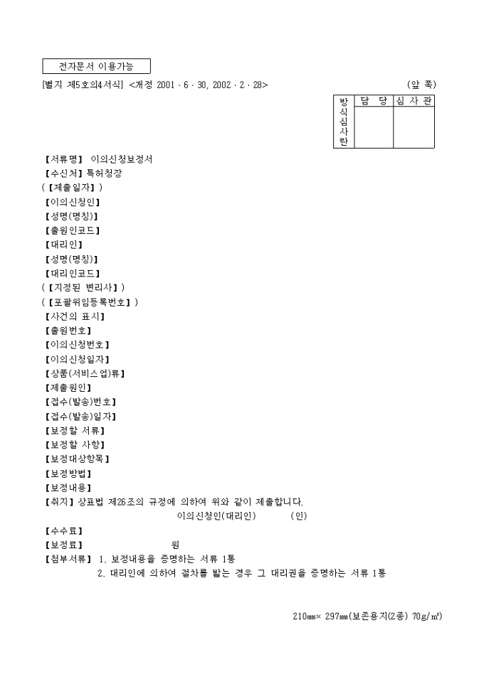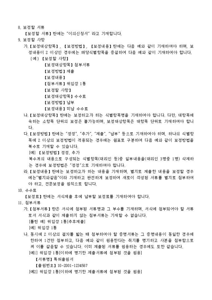 9,000원/월이 서식은 [별지 제5호의4서식]이의신청보정서로서 보정내용을 증명하는 서류 1통과 대리인에 의하여 절차를 밟는 경우 그 대리권을 증명하는 서류 1통이 필요합니다.