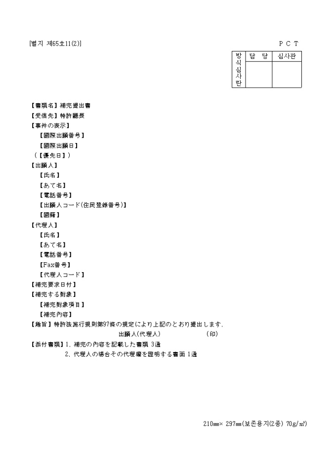 9,000원/월이 서식은 [별지 제65호11(2)]보완제출서로서 일어(한문)으로 작성되어 있습니다.