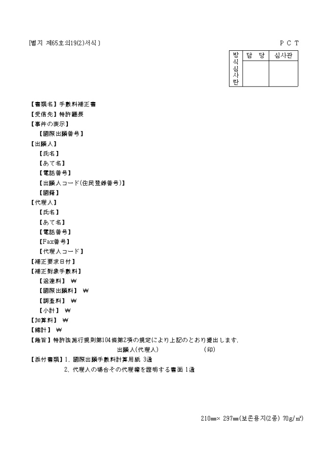 9,000원/월이 서식은 [별지 제65호19(2)]보정서로서 일어(한문)으로 작성되어 있습니다.