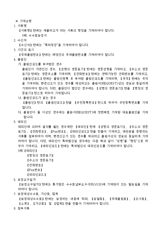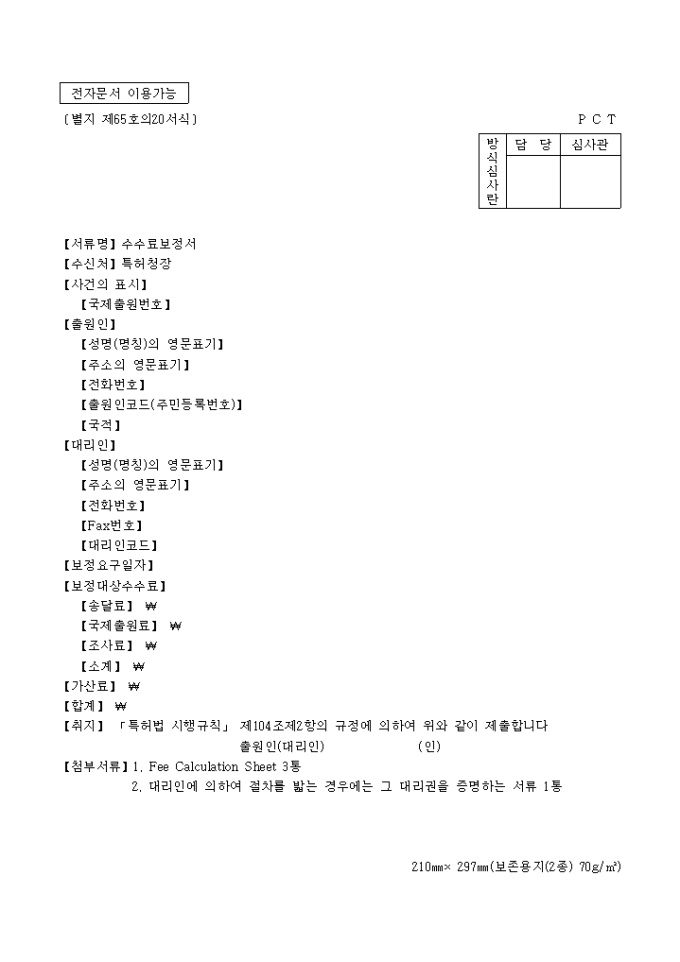 이 서식은 [별지 제65호20]수수료보정서로서 Fee Calculation Sheet 3통, 대리인에 의하여 절차를 밟는 경우에는 그 대리권을 증명하는 서류 1통이 필요합니다.