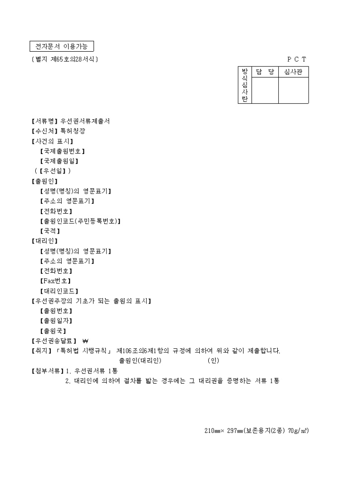 9,000원/월이 서식은 별지 제65호28]우선권서류제출서로서 필요한 서류로는 우선권서류 1통, 대리인에 의하여 절차를 밟는 경우에는 그 대리권을 증명하는 서류 1통이 있습니다.