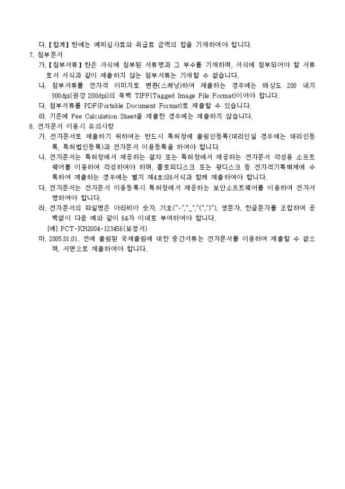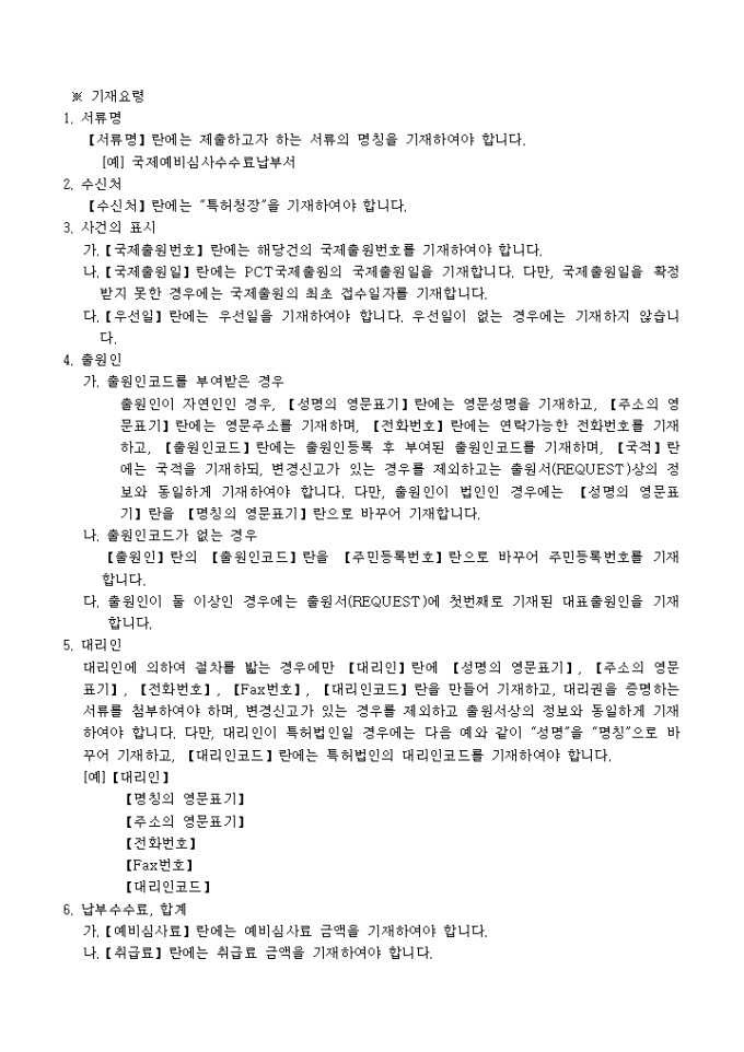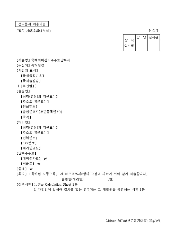 9,000원/월이 서식은 [별지 제65호41]국제예비심사수수료납부서로서 필요한 서류로는 Fee Calculation Sheet 2통, 대리인에 의하여 절차를 밟는 경우에는 그 대리권을 증명하는 서류 1통이 있습니다.