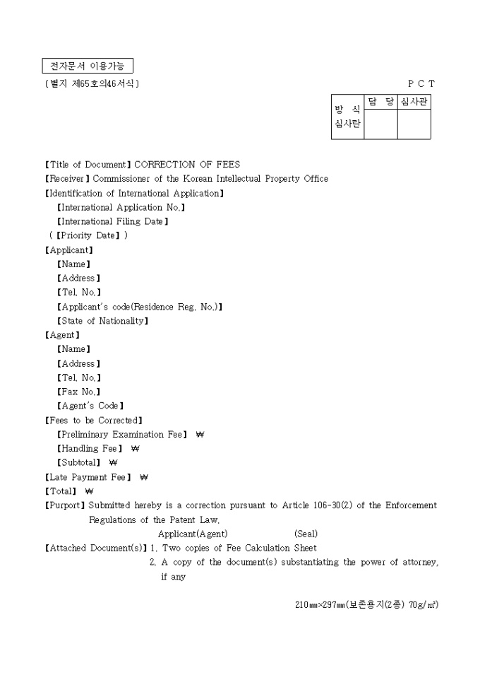 9,000원/월이 서식은 [별지 제65호46]CORRECTION OF FEES로서 영문으로 작성되어 있습니다.