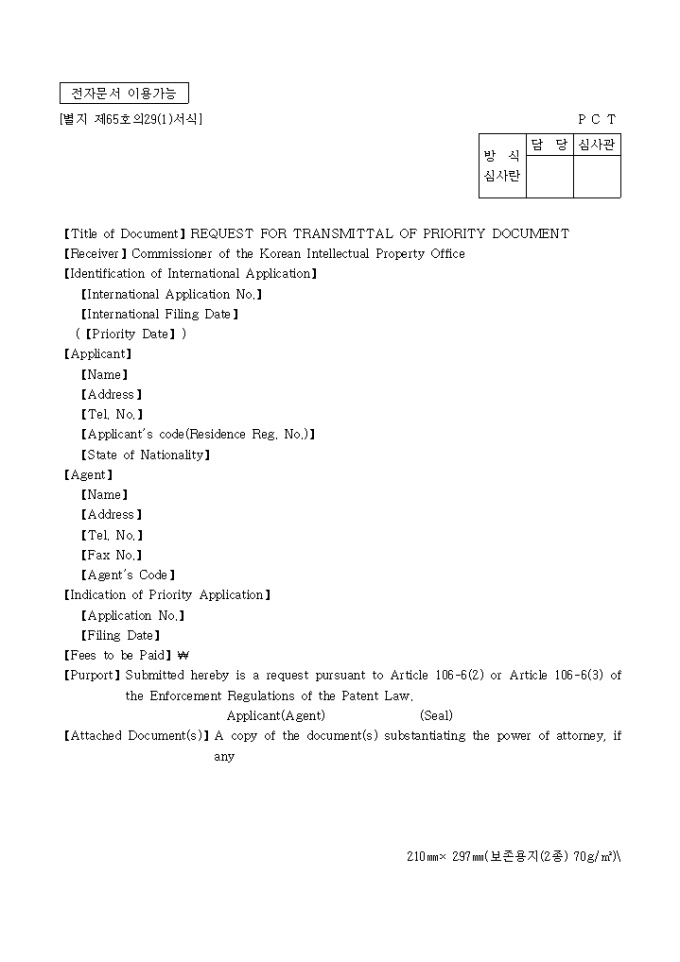 9,000원/월이 서식은 [별지 제65호의29(1)서식]REQUEST FOR TRANSMITTAL OF PRIORITY DOCUMENT로서 영문으로 작성되어 있습니다.