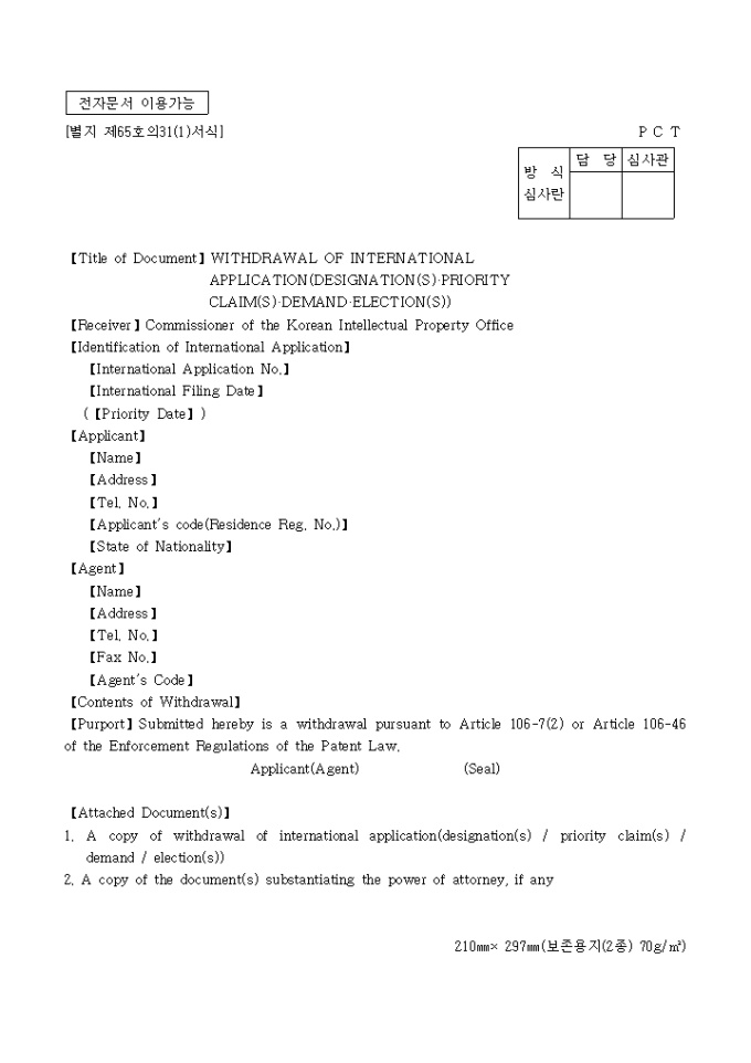 9,000원/월이 서식은 [별지 제65호의31(1)서식]WITHDRAWAL OF [INTERNATIONAL APPLICATION·DESIGNATION·PRIORITY CLAIM]로서 영문으로 작성되어 있습니다.