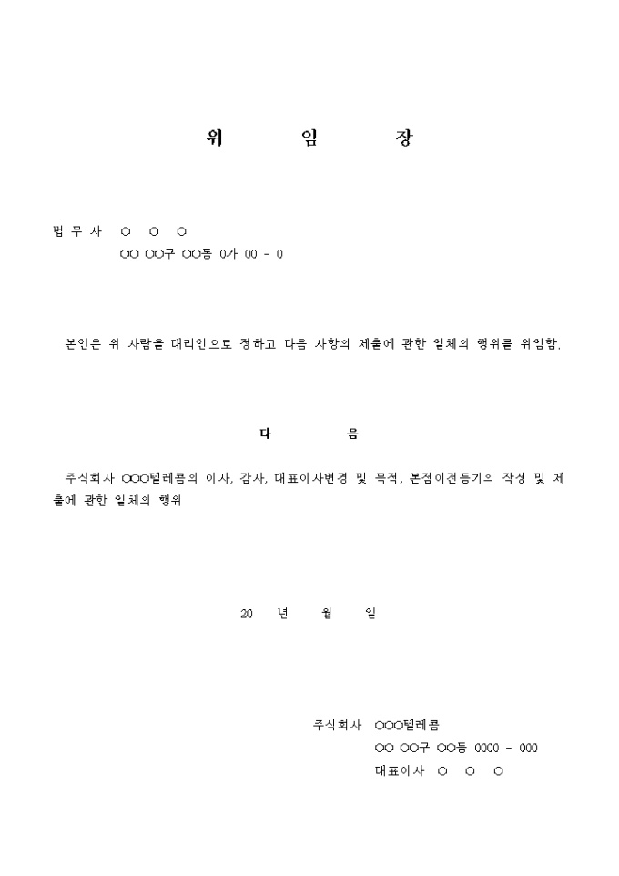 9,000원/월이사, 감사, 대표이사 변경등기 신청서의 작성 및 제출하는 일체의 행위에 대한 권한을 위임하는 위임장입니다.