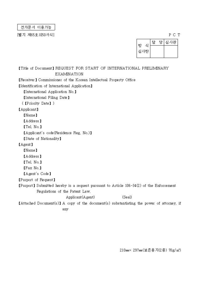 9,000원/월이 서식은 [별지 제65호의50서식]REQUEST FOR START OF INTERNATIONAL PRELIMINARY EXAMINATION로서 영문으로 작성되어 있습니다.