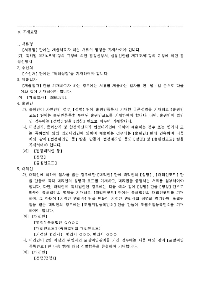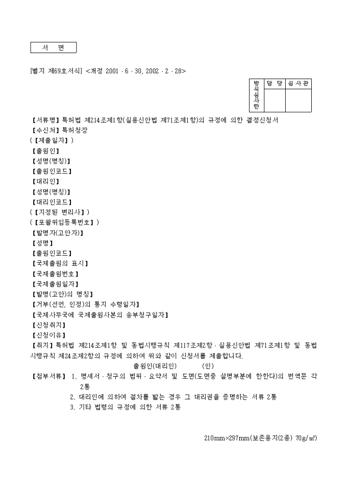 9,000원/월이 서식은 [별지 제69호서식]특허법 제214조 제1항(실용신안법제71조제1항)의 규정에의한 결정신청서로서 필요한 서류로는 명세서·청구의 범위·요약서 및 도면(도면중 설명부분에 한한다)의 번역문 각 2통, 대리인에 의하여 절차를 밟는 경우 그 대리권을 증명하는 서류 2통, 기타 법령의 규정에 의한 서류 2통이 있습니다.
