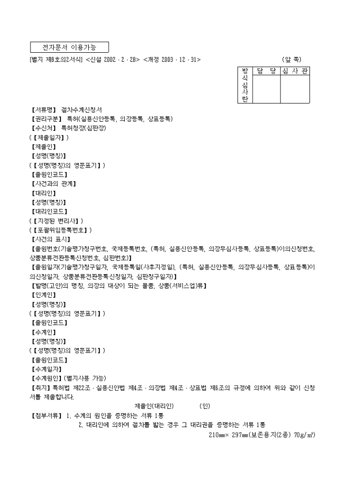 9,000원/월이 서식은 [별지 제8호의2서식]절차수계신청서로서 필요한 서류로는 수계의 원인을 증명하는 서류 1통, 대리인에 의하여 절차를 밟는 경우 그 대리권을 증명하는 서류 1통이 있습니다.