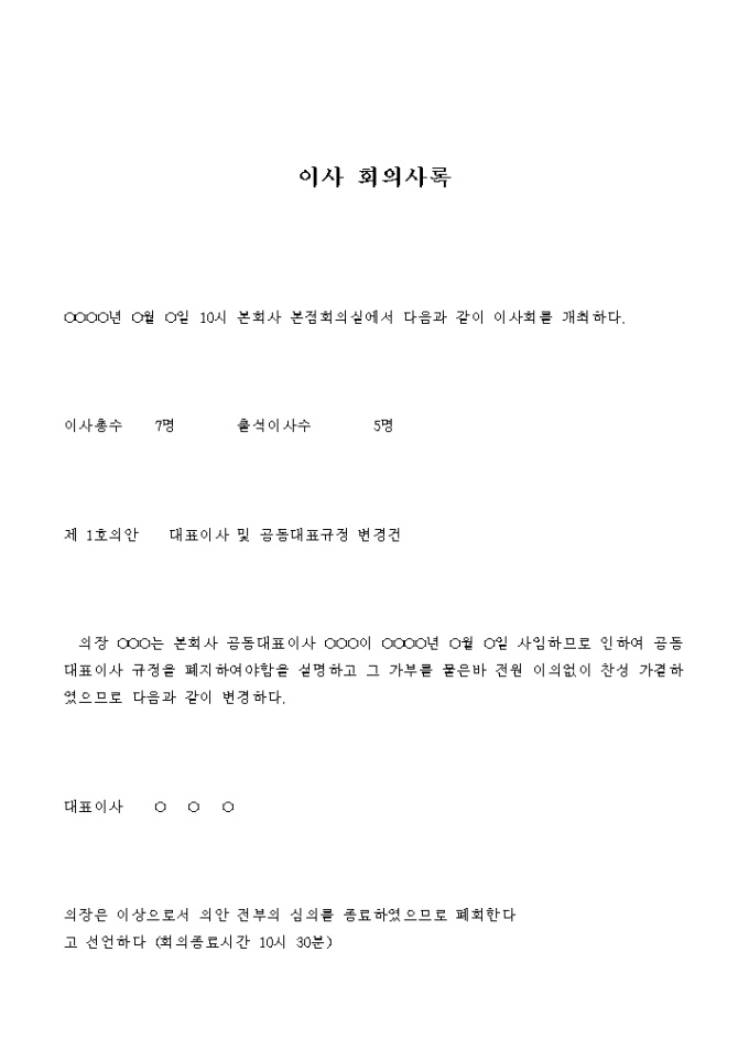 9,000원/월대표이사 및 공동대표폐지에 관한 규정을 변경하는 이사회의 회의록입니다.
