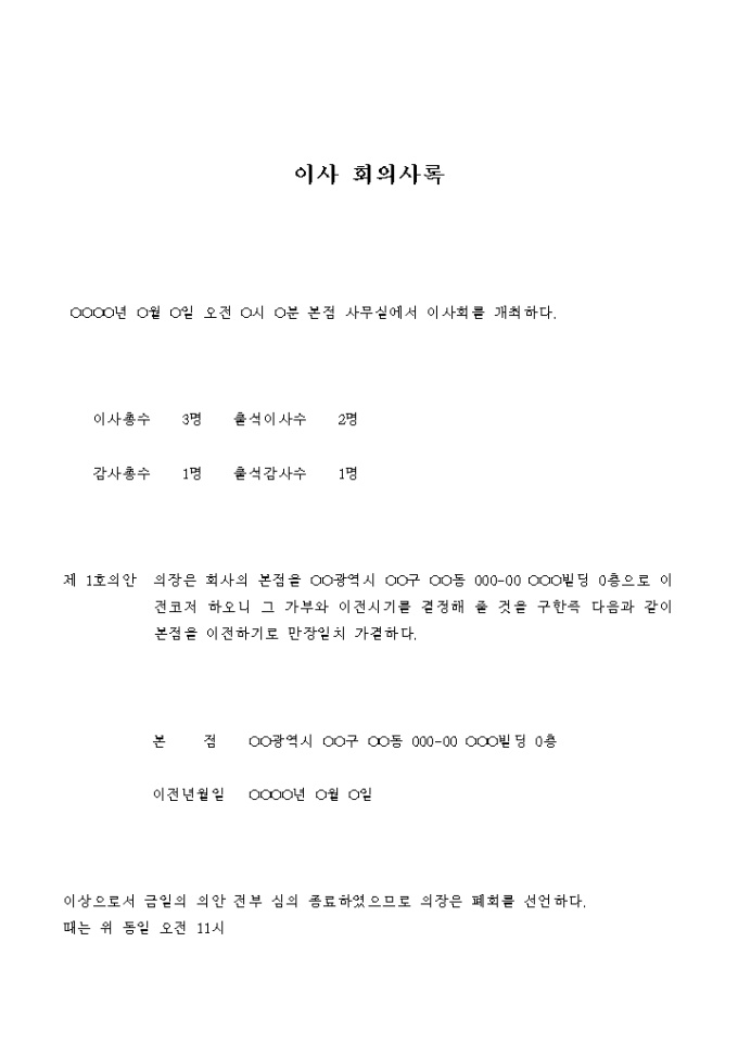 9,000원/월본점의 이전을 결의하는 이사회의 의사록입니다.