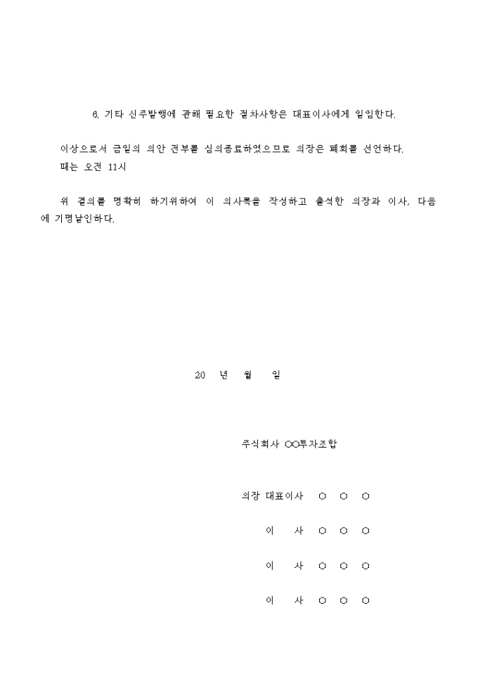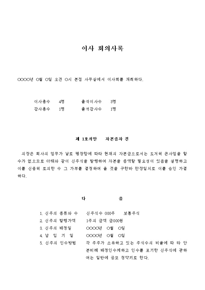 자본증자에 대한 사항을 결의한 이사회의 의사록입니다.