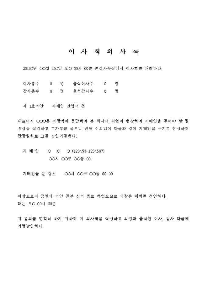 9,000원/월지배인 선임에 관한 사항을 의결한 이사회의 의사록입니다.
