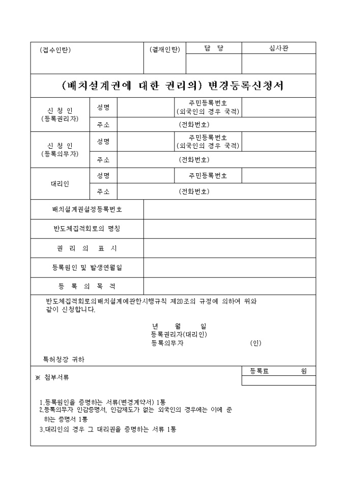 이 서식은 (배치설계권에 대한 권리의)변경등록신청서로서 필요한 서류로는 등록원인을 증명하는 서류(변경계약서) 1통, 등록의무자 인감증명서, 인감제도가 없는 외국인의 경우에는 이에 준하는 증명서 1통, 대리인의 경우 그 대리권을 증명하는 서류 1통이 있습니다.