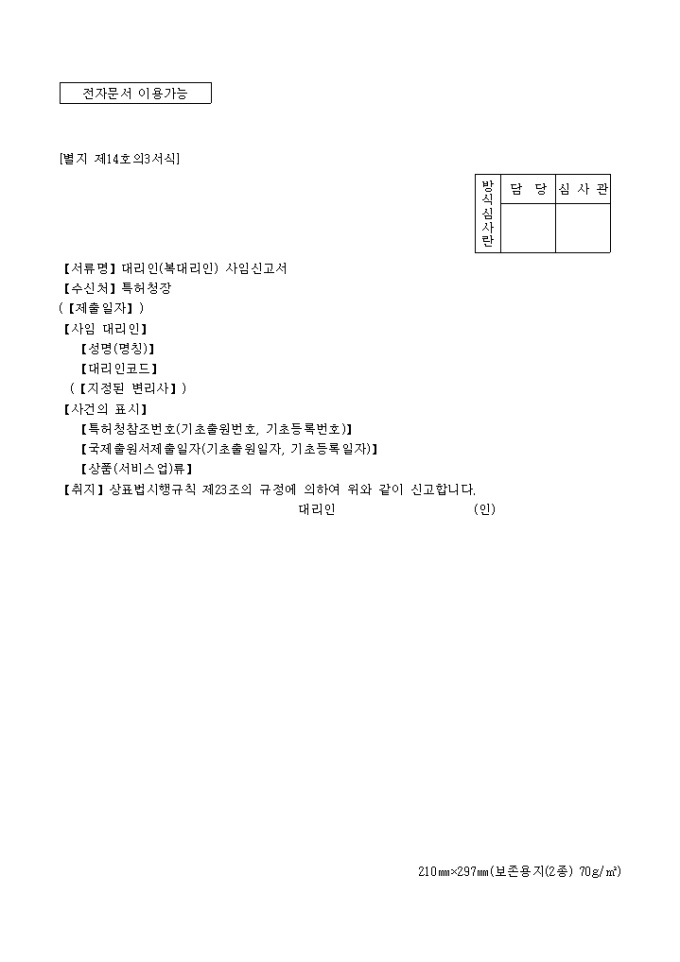 9,000원/월이 서식은 특허청에서 사용되는 [별지 제14호3]로 대리인(복대리인)의 사임을 알리는 신고서입니다.