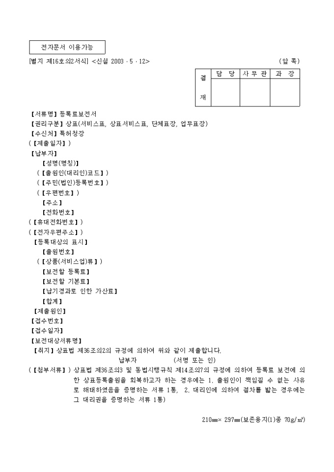 9,000원/월이 서식은 특허청에서 사용되는 [별지 제16호의2서식]등록료 보전서로서 03년 5월 12일 개정되었습니다.