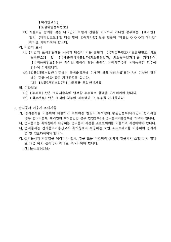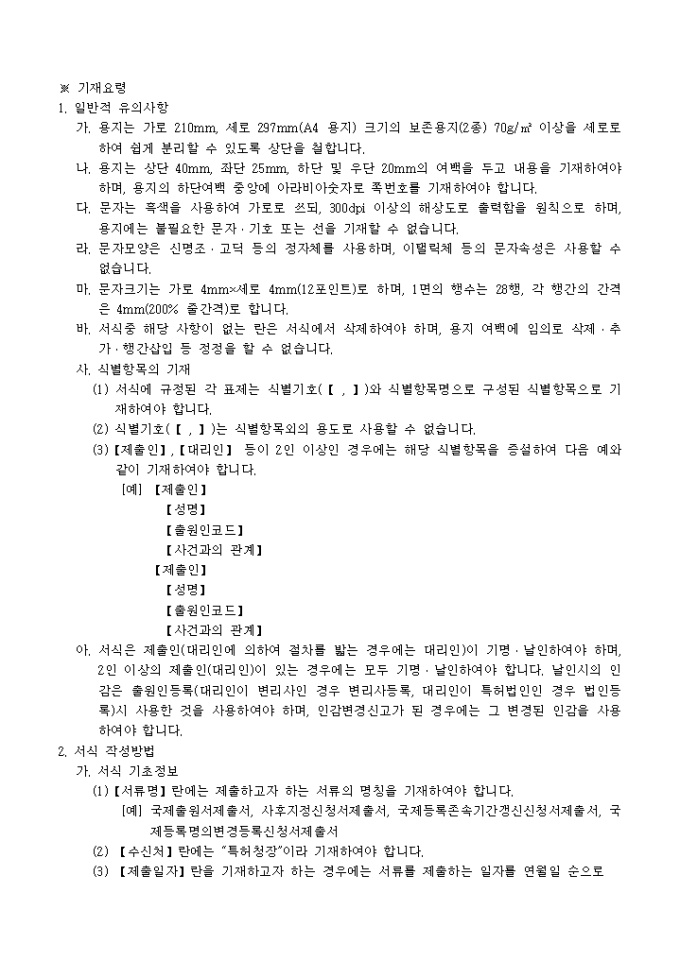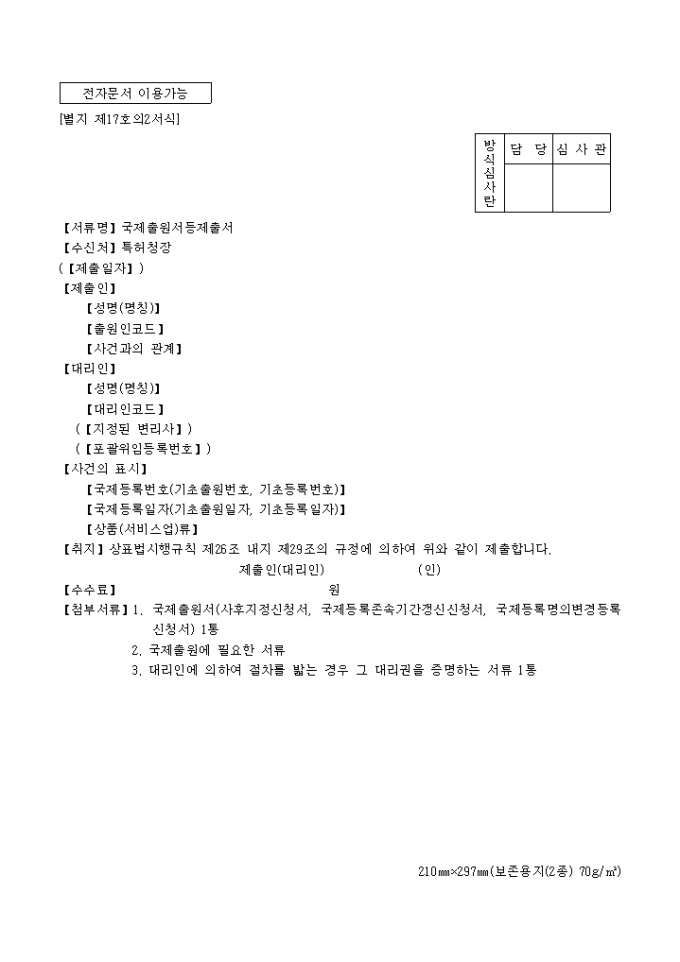 이 서식은 [별지 제17호2]국제출원서등제출서로서 필요한 서류로는 국제출원서(사후지정신청서, 국제등록존속기간갱신신청서, 국제등록명의변경등록신청서) 1통, 국제출원에 필요한 서류, 대리인에 의하여 절차를 밟는 경우 그 대리권을 증명하는 서류 1통이 있습니다.