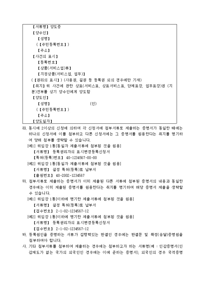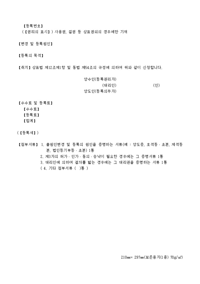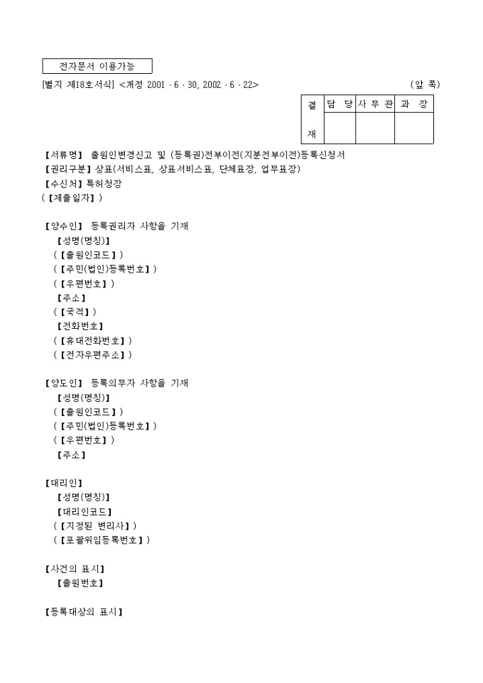 이 서식은 [별지 제18호서식]출원인변경신고 및 (등록권)전부이전(지분전부이전)등록신청서로서 필요한 서류로는 출원인변경 및 등록의 원인을 증명하는 서류(예 : 양도증, 호적등·초본, 제적등본, 법인등기부등·초본) 1통, 제3자의 허가·인가·동의·승낙이 필요한 경우에는 그 증명서류 1통, 대리인에 의하여 절차를 밟는 경우에는 그 대리권을 증명하는 서류 1통이 있습니다.