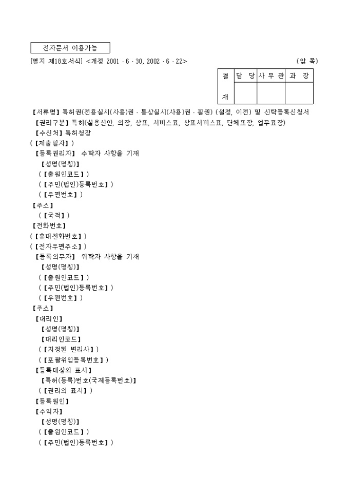 특허권(전용실시(사용)권·통상실시(사용권·질권)(설정, 이전)(별지 제18호서식)
