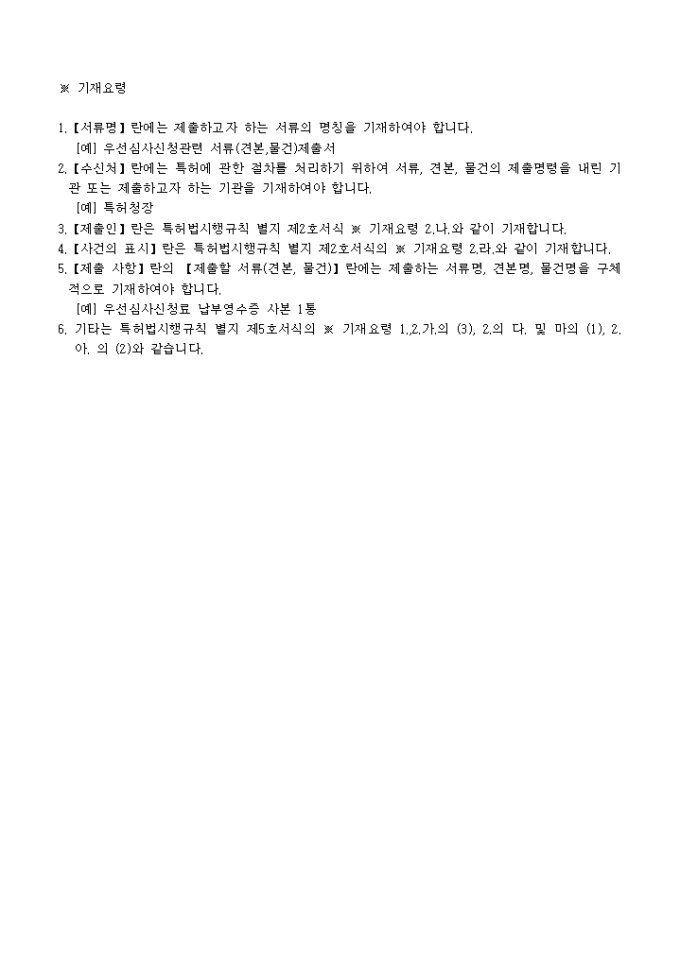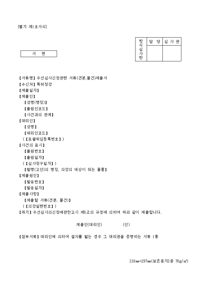 9,000원/월이 서식은 [별지 제1호서식]우선심사신청관련서류(견본,물건)제출서로서 필요한 서류로는 대리인에 의하여 절차를 밟는 경우 그 대리권을 증명하는 서류 1통 이 있습니다.