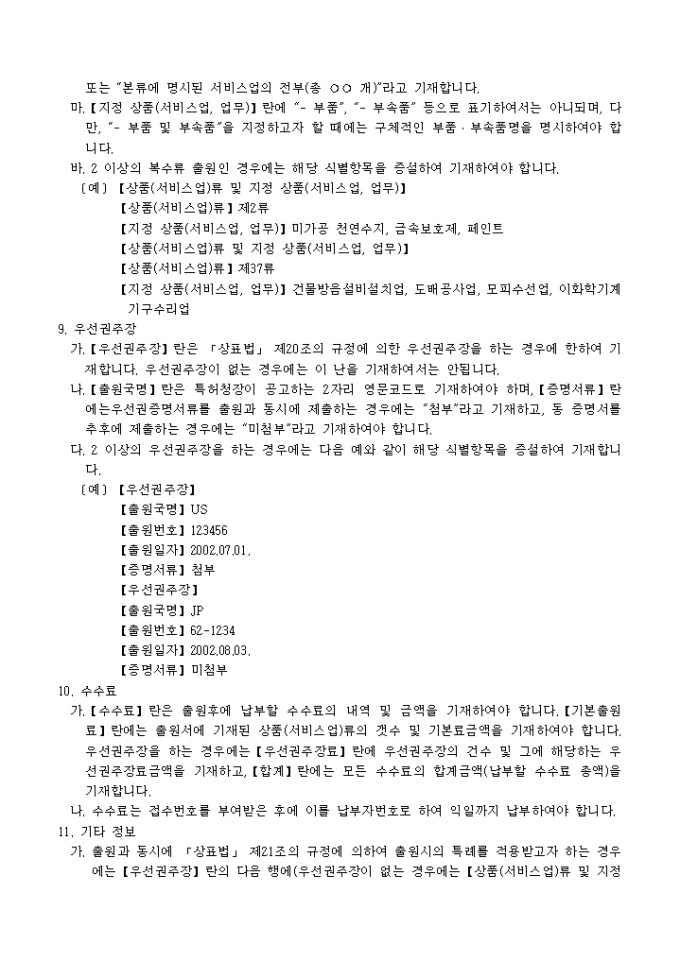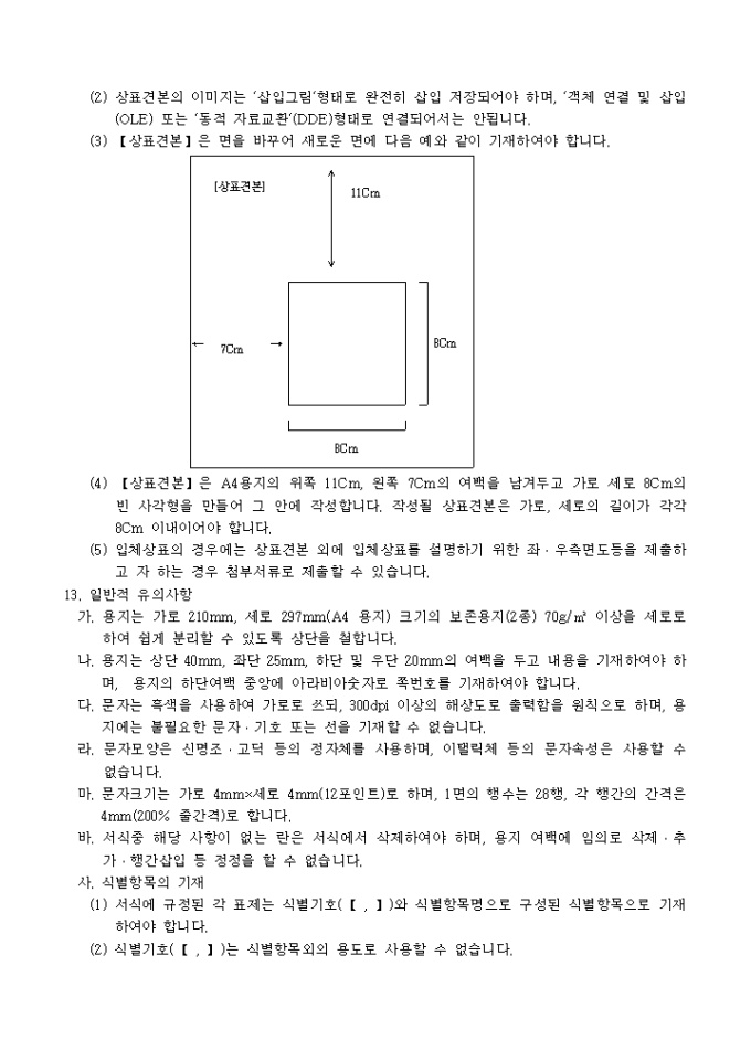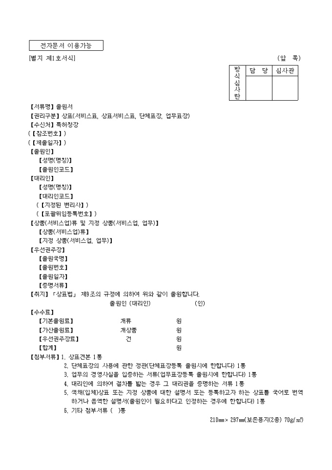 9,000원/월이 서식은 [별지 제1호서식]출원서로서 필요한 서류로는 상표견본 1통, 단체표장의 사용에 관한 정관(단체표장등록 출원시에 한합니다) 1통, 업무의 경영사실을 입증하는 서류(업무표장등록 출원시에 한합니다) 1통, 대리인에 의하여 절차를 밟는 경우 그 대리권을 증명하는 서류 1통, 색채(입체)상표 또는 지정 상품에 대한 설명서 또는 등록하고자 하는 상표를 국어로 번역하거나 음역한 설명서(출원인이 필요하다고 인정하는 경우에 한합니다) 1통, 기타 첨부서류 ( )통이 있습니다.