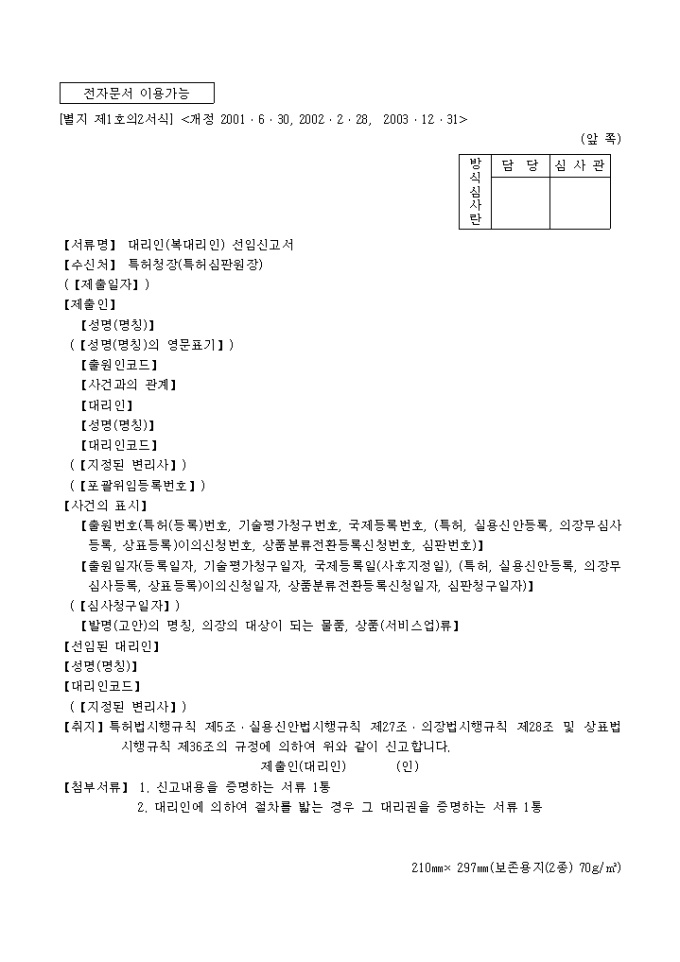 9,000원/월이 서식은 특허청에서 사용되는 [별지 제1호의2서식]의 대리인 혹은 복대리인의 선임을 알리는 신고서로서 03년 12월 31일에 개정되었습니다.