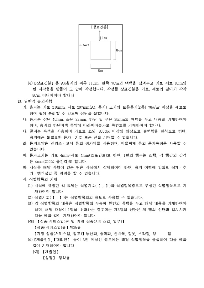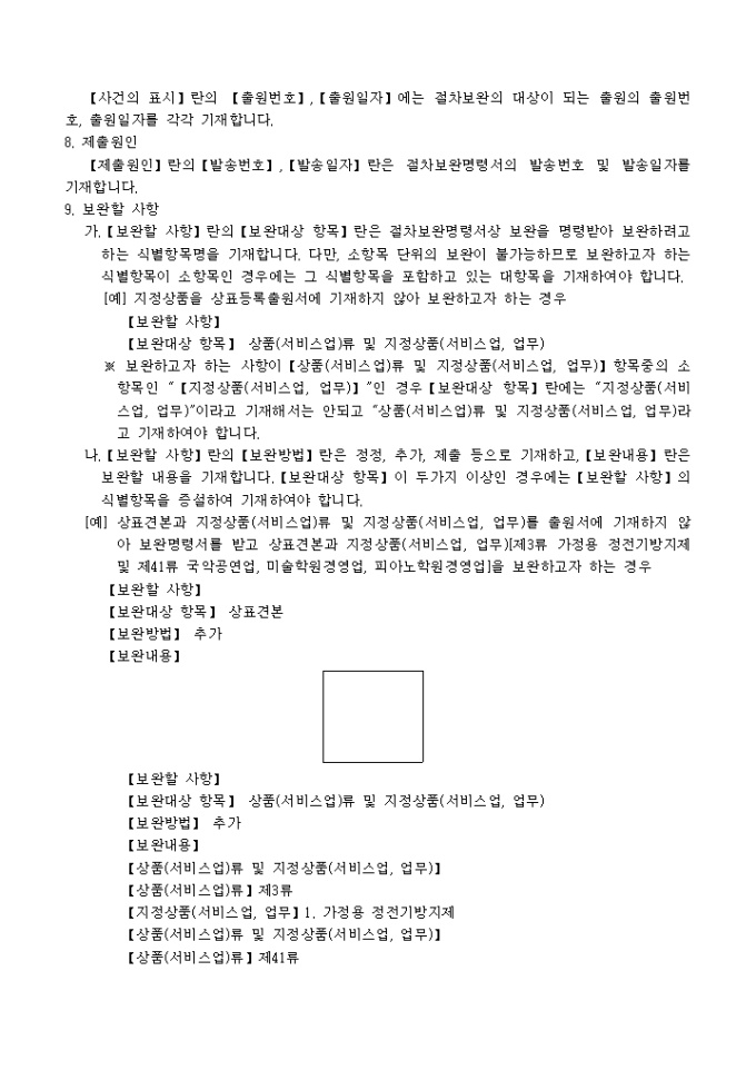 이 서식은 [별지 제1호의2서식]절차보완서로서 필요한 서류로는 상표견본(상표견본을 보완하는 경우에 한합니다) 1통, 국어로 작성한 출원서(출원서를 국어로 기재하지 않은 경우에 한합니다) 1통, 대리인에 의하여 절차를 밟는 경우 그 대리권을 증명하는 서류 1통이 있습니다.