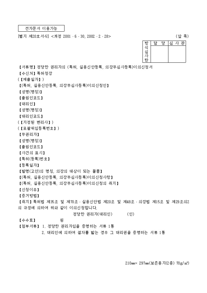 이 서식은 특허청에서 사용되는 서식으로 [별지 제20호서식]정당한권리자의(특허,실용신안등록,의장무심사등록)이의신청서입니다.