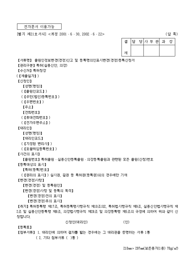 9,000원/월이 서식은 특허청에서 사용되는 [별지 제21호서식]의 출원인정보변경(경정)신고 및 등록명의인표시변경(경정)등록할때 사용되는 신청서입니다.
