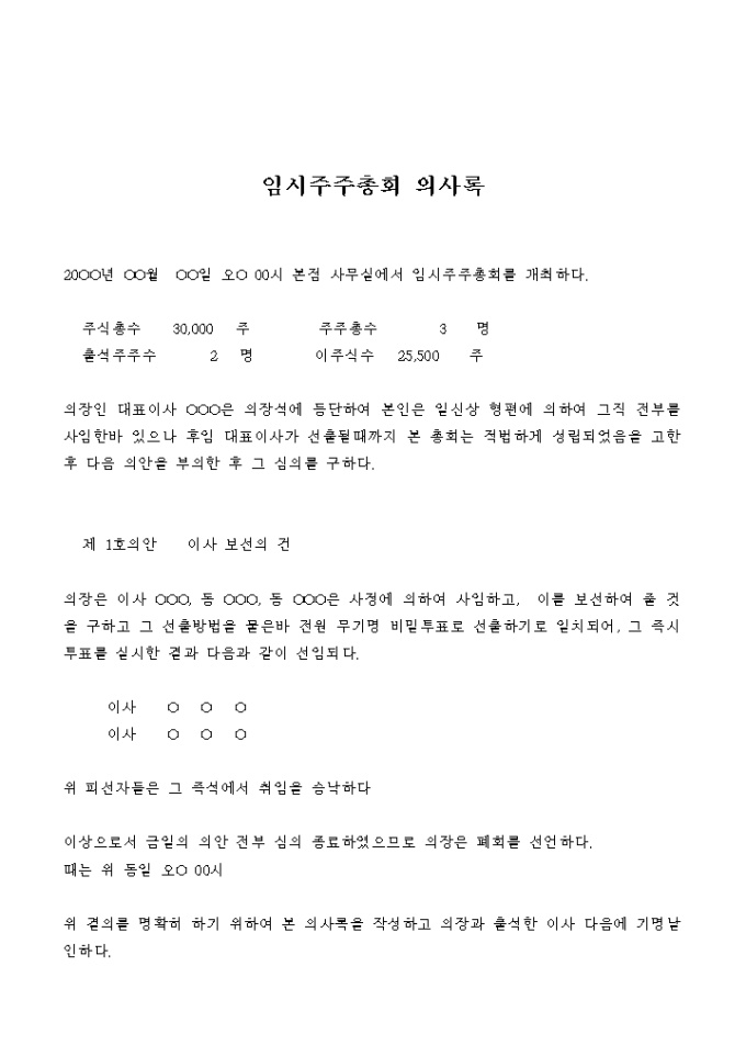 9,000원/월이사의 보선을 결의하는 임시주주총회의 의사록입니다.