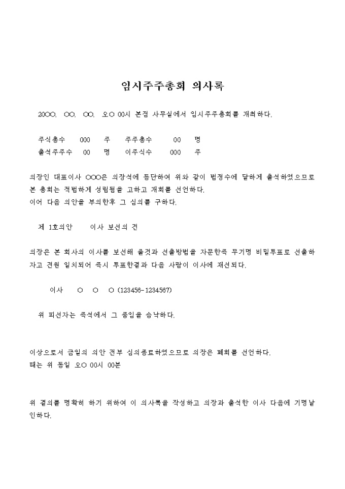 이사의 보선을 결의한 임시주주총회의 의사록입니다.